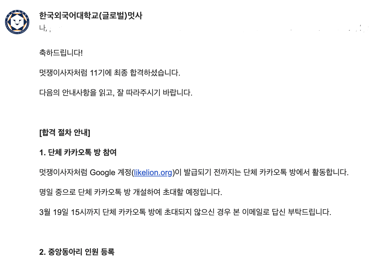 웹개발 IT 연합 동아리 '멋쟁이 사자처럼 (이하 멋사)' 대학 11기에 지원해서 합격하였다.